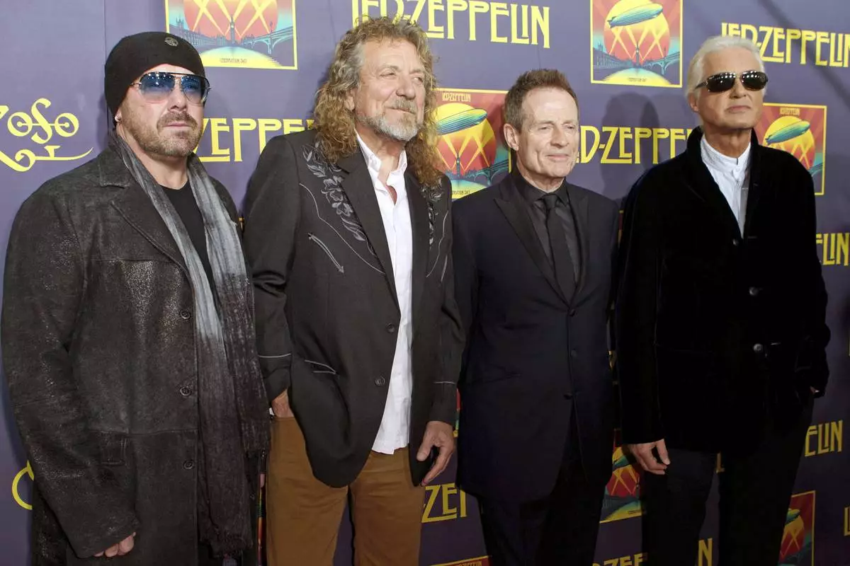 FILE - Jason Bonham, son of late Led Zeppelin drummer John Bonham;, from left, singer Robert Plant; bassist John Paul Jones; and guitarist Jimmy Page at the "Led Zeppelin: Celebration Day" premiere in New York on Oct. 9, 2012. (Photo by Dario Cantatore/Invision/AP, File)
