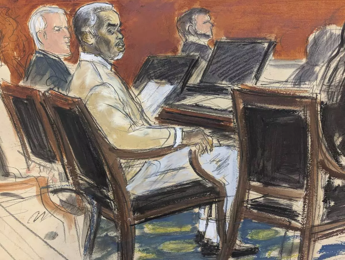 Sean ' Diddy' Combs, second from left, watches from the defense table as Judge Arun Subramanian speaks to the jury in Manhattan federal court, Tuesday, July 1, 2025, in New York. (Elizabeth Williams via AP)