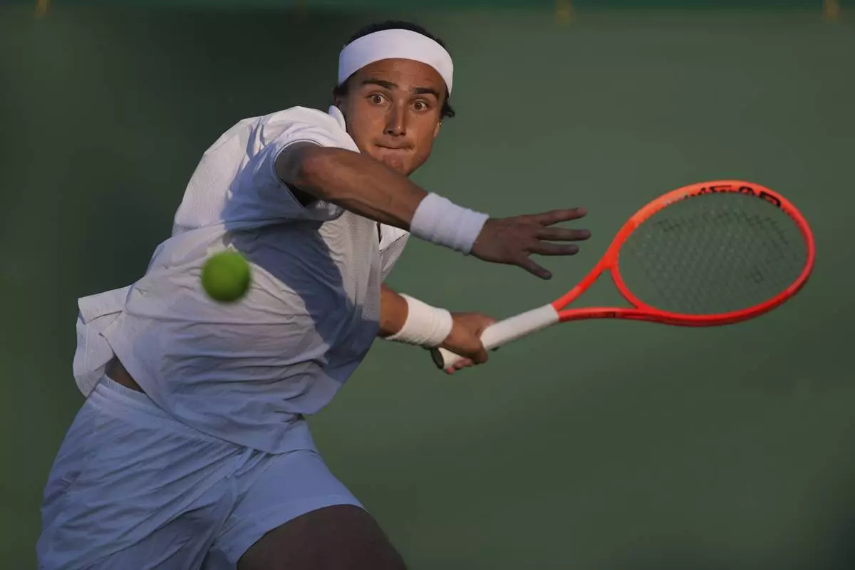 Mattia Bellucci of Italy plays a return to Jiri Lehecka of Czech Republic during the second round men's singles match at the Wimbledon Tennis Championships in London, Wednesday, July 2, 2025.(AP Photo/Kin Cheung)
