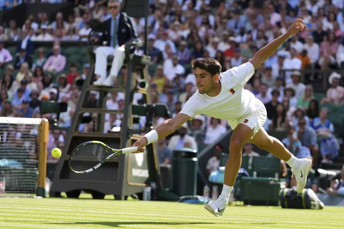 Carlos Alcaraz of Spain returns the ball to Oliver Tarvet of Britain in his second round men's singles match at the Wimbledon Tennis Championships in London, Wednesday, July 2, 2025.(AP Photo/Kirsty Wigglesworth)