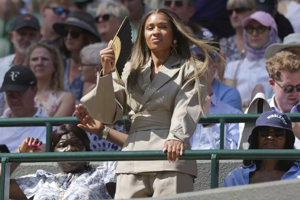 Ayan Broomfield the girlfriend of Frances Tiafoe of the U.S. watches as he plays Cameron Norrie of Britain during their second round men's singles match at the Wimbledon Tennis Championships in London, Wednesday, July 2, 2025. (AP Photo/Alastair Grant)