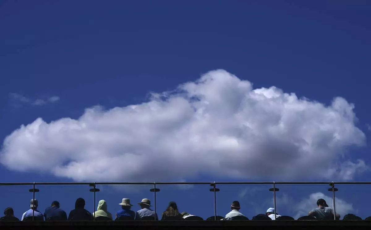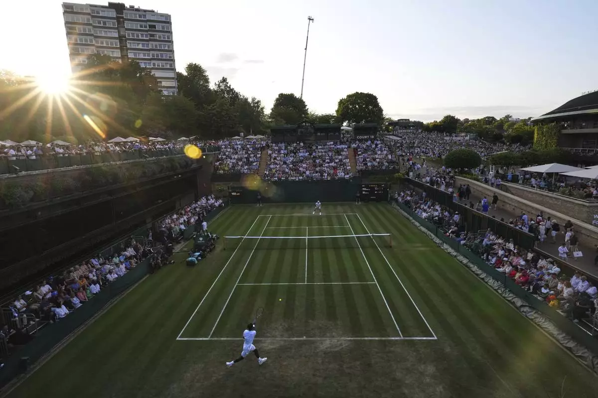 Spectators watch tennis on court three during the Wimbledon Tennis Championships in London, Thursday, July 3, 2025.(AP Photo/Kirsty Wigglesworth)