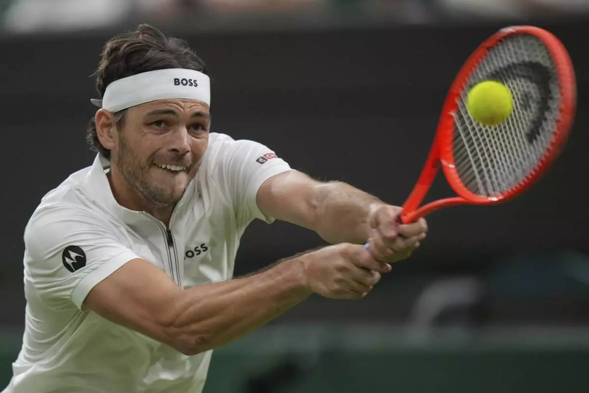 Taylor Fritz of the U.S. returns to Gabriel Diallo of Canada during their second round men's singles match at the Wimbledon Tennis Championships in London, Wednesday, July 2, 2025. (AP Photo/Alastair Grant)