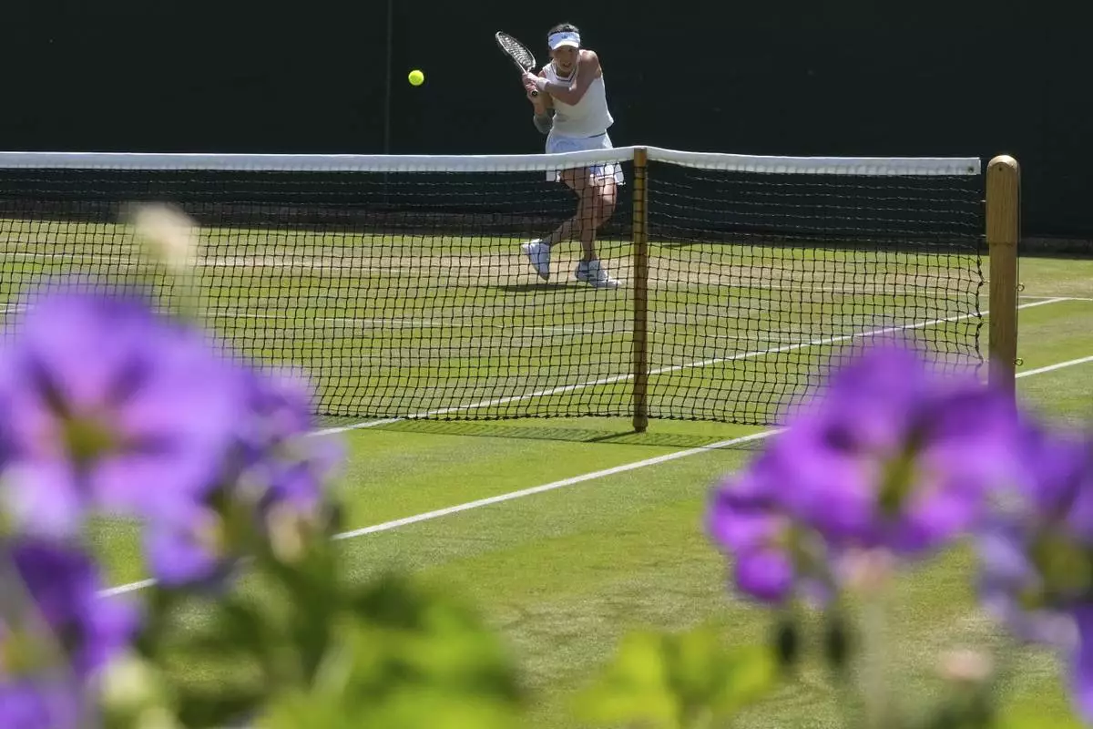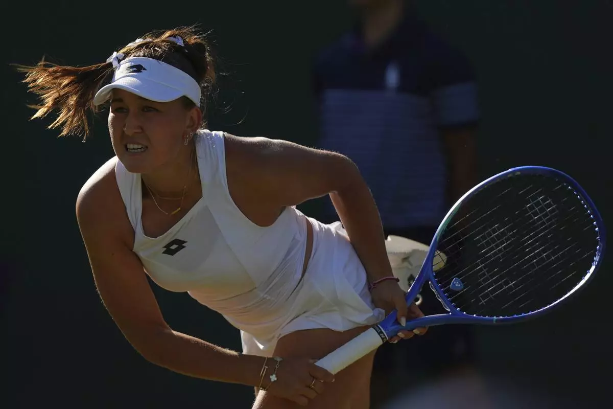 Xinyu Wang of China plays a return to Zeynep Sonmez of Turkey during their second round women's singles match at the Wimbledon Tennis Championships in London, Thursday, July 3, 2025.(AP Photo/Kirsty Wigglesworth)