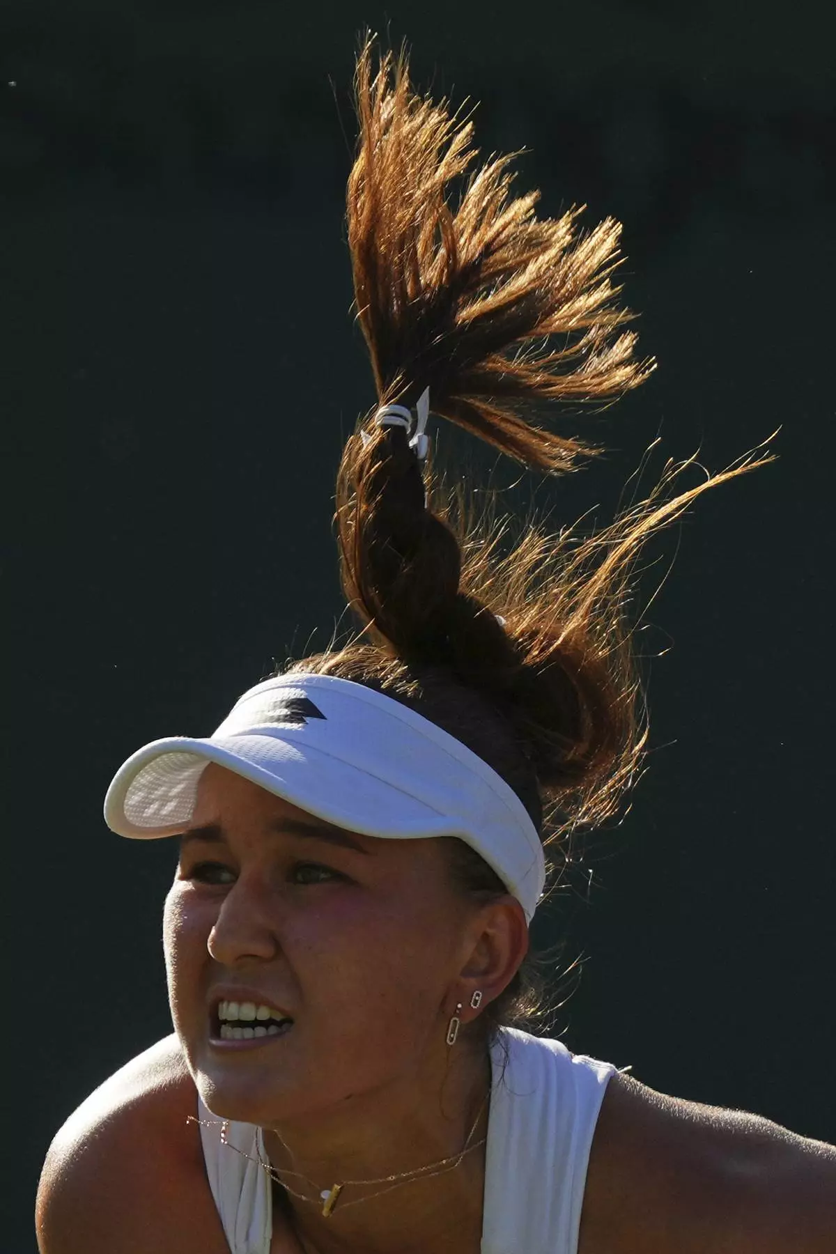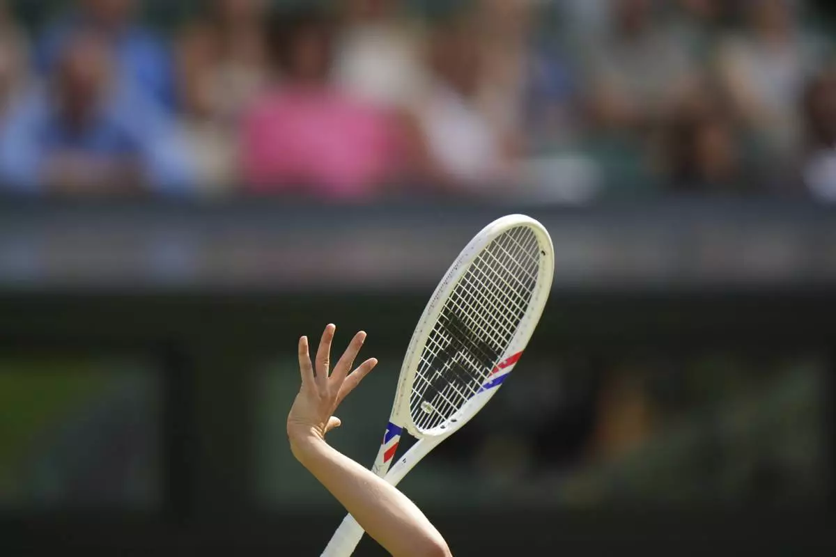 Russia's Kamilla Rakhimova serves to Jasmine Paolini of Italy during their second round women's singles match at the Wimbledon Tennis Championships in London, Wednesday, July 2, 2025. (AP Photo/Joanna Chan)