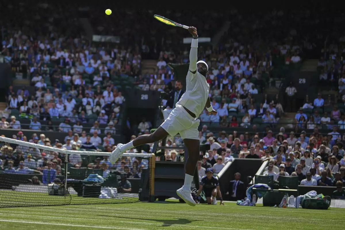 Frances Tiafoe of the U.S. plays a backhand overhead smash to Cameron Norrie of Britain during their second round men's singles match at the Wimbledon Tennis Championships in London, Wednesday, July 2, 2025. (AP Photo/Alastair Grant)
