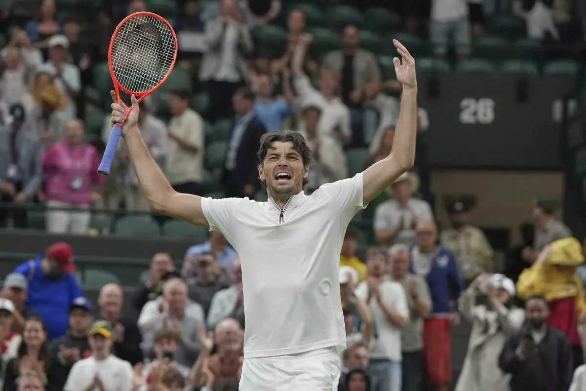 Taylor Fritz of the U.S. reacts after beating Gabriel Diallo of Canada in their second round men's singles match at the Wimbledon Tennis Championships in London, Wednesday, July 2, 2025. (AP Photo/Alastair Grant)