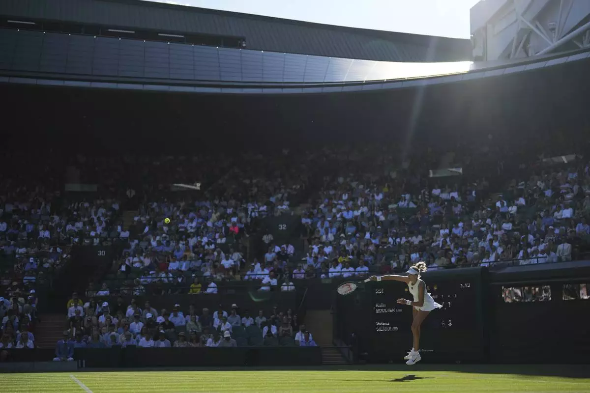 Iga Swiatek of Poland serves to Caty McNally of the U.S. during their second round women's singles match at the Wimbledon Tennis Championships in London, Thursday, July 3, 2025. (AP Photo/Alastair Grant)