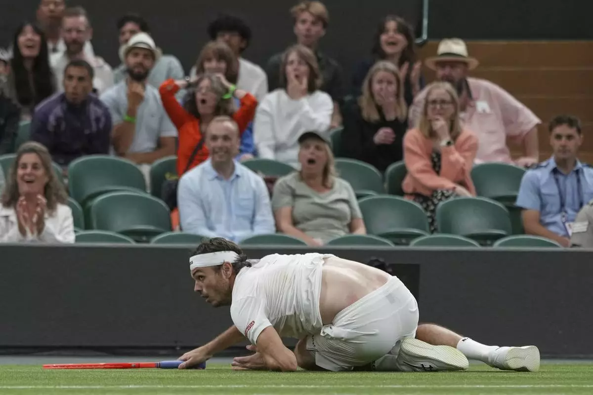 Taylor Fritz of the U.S. falls after he dived to return to Gabriel Diallo of Canada during their second round men's singles match at the Wimbledon Tennis Championships in London, Wednesday, July 2, 2025. (AP Photo/Alastair Grant)