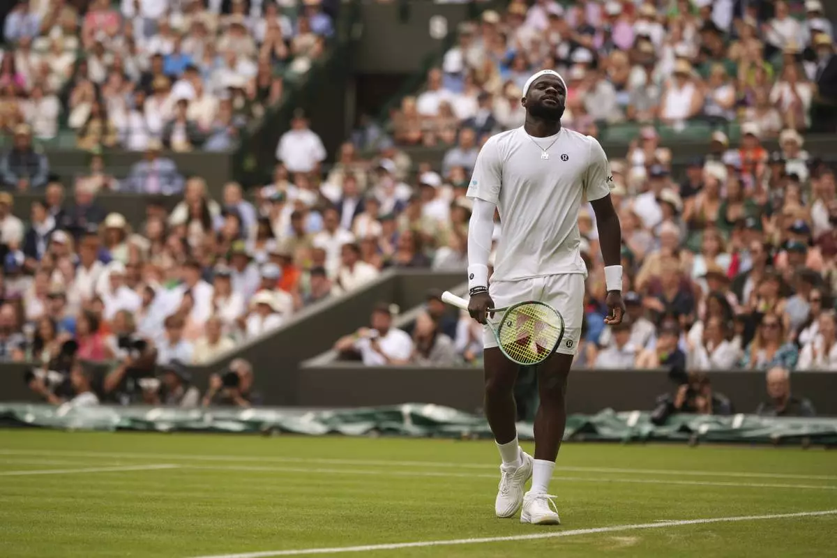 Frances Tiafoe of the U.S. reacts after missing a point as he plays Cameron Norrie of Britain during their second round men's singles match at the Wimbledon Tennis Championships in London, Wednesday, July 2, 2025. (AP Photo/Alastair Grant)