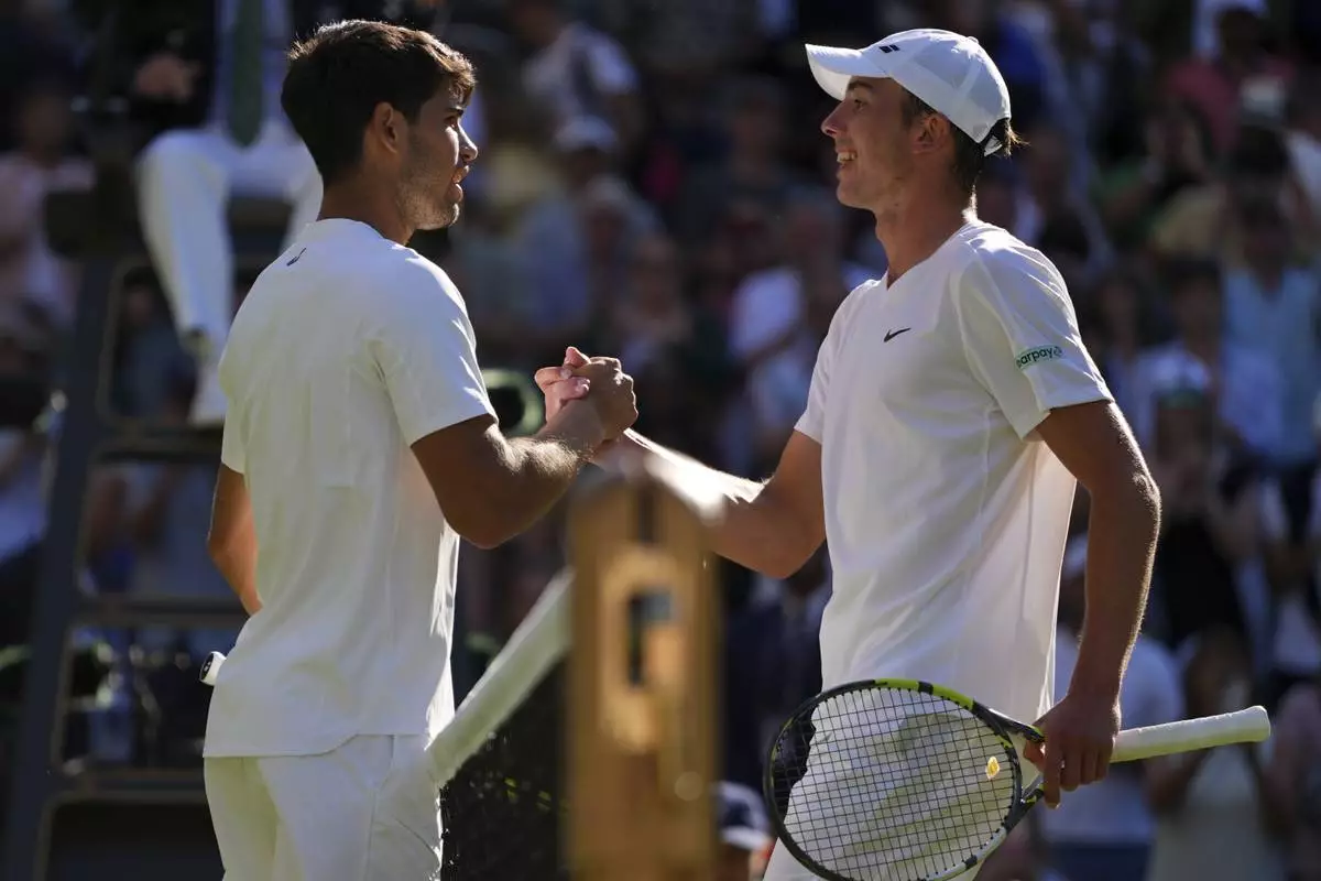 Carlos Alcaraz of Spain and Oliver Tarvet of Britain, right, ishake hands after their second round men's singles match at the Wimbledon Tennis Championships in London, Wednesday, July 2, 2025.(AP Photo/Kirsty Wigglesworth)