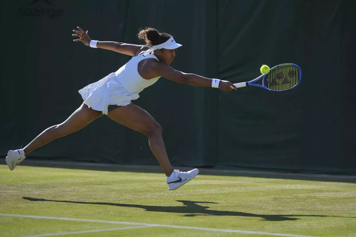 Naomi Osaka of Japan plays a return to Katerina Siniakova of Czech Republic during their second round women's single match at the Wimbledon Tennis Championships in London, Wednesday, July 2, 2025.(AP Photo/Kin Cheung)