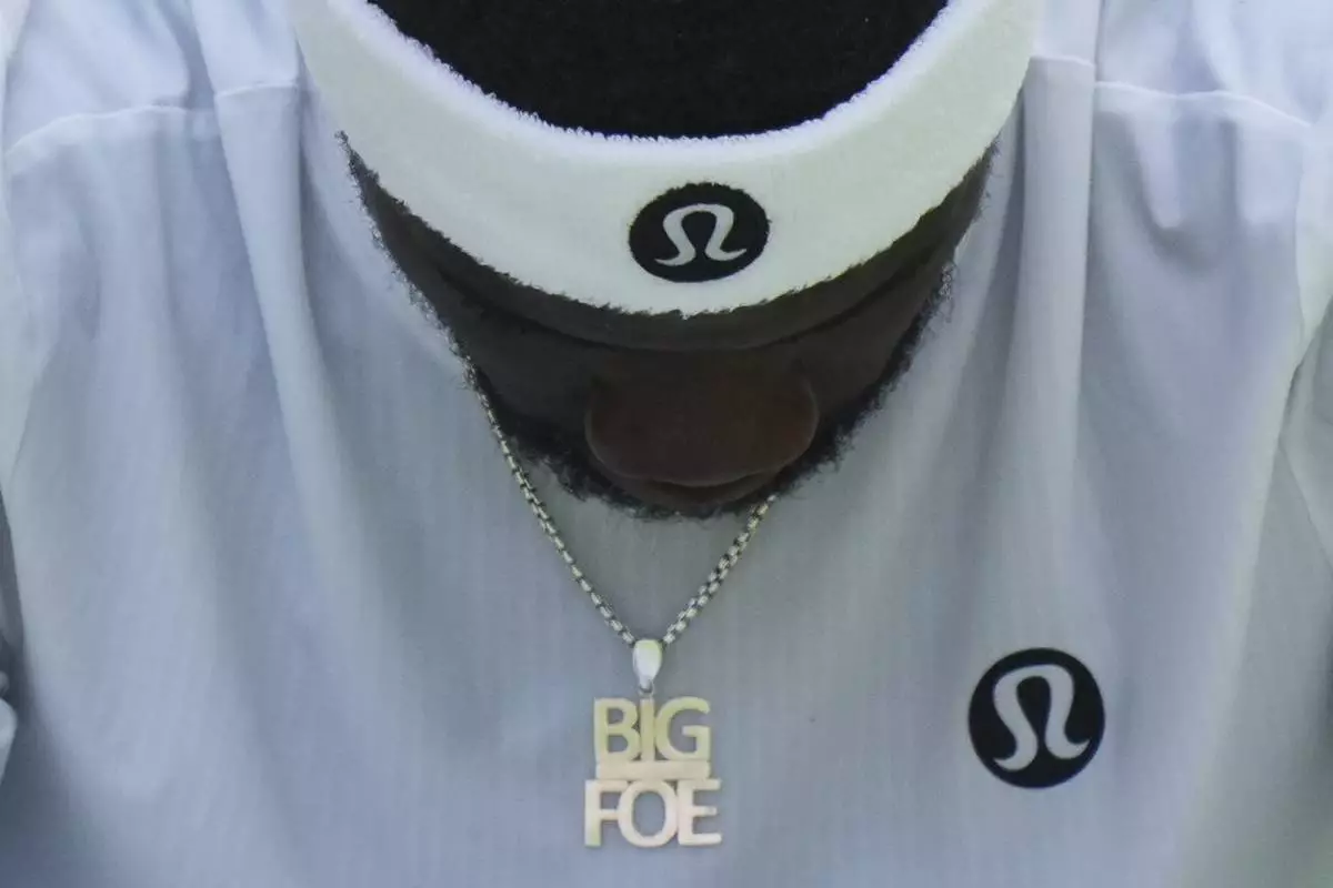 Frances Tiafoe of the U.S. looks down during a change of ends break as he plays Cameron Norrie of Britain during their second round men's singles match at the Wimbledon Tennis Championships in London, Wednesday, July 2, 2025. (AP Photo/Alastair Grant)