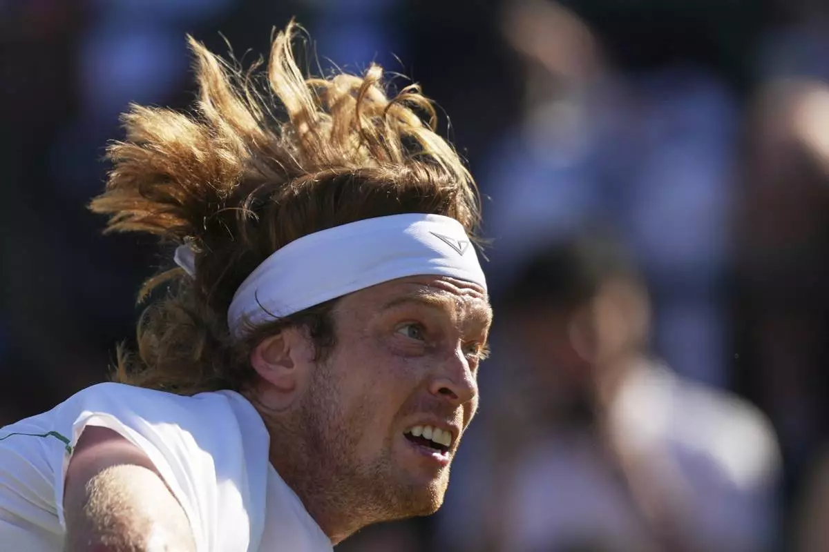 Andrey Rublev of Russia serves to Lloyd Harris of South Africa during their second round men's singles match at the Wimbledon Tennis Championships in London, Wednesday, July 2, 2025. (AP Photo/Joanna Chan)