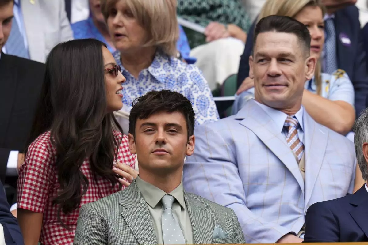 Singer Olivia Rodrigo, left, Olympic gold medallist Tom Daley, center, and wrestler John Cena sit in the Royal Box at Centre Court during the Wimbledon Tennis Championships in London, Wednesday, July 2, 2025.(AP Photo/Kirsty Wigglesworth)