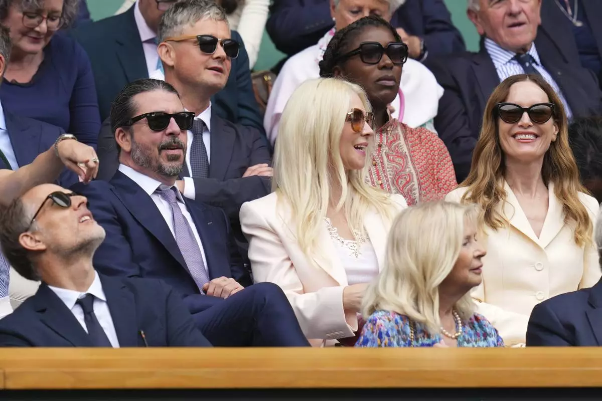 Musician Dave Grohl his wife Jordyn, centre, and actor Leslie Mann sit in the Royal Box at Centre Court during the Wimbledon Tennis Championships in London, Wednesday, July 2, 2025.(AP Photo/Kirsty Wigglesworth)
