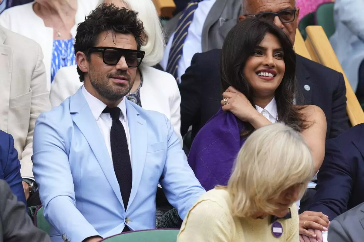 Indian actress Priyanka Chopra, right, and English actor Dominic Cooper sit in the Royal Box at Centre Court during the Wimbledon Tennis Championships in London, Wednesday, July 2, 2025.(AP Photo/Kirsty Wigglesworth)