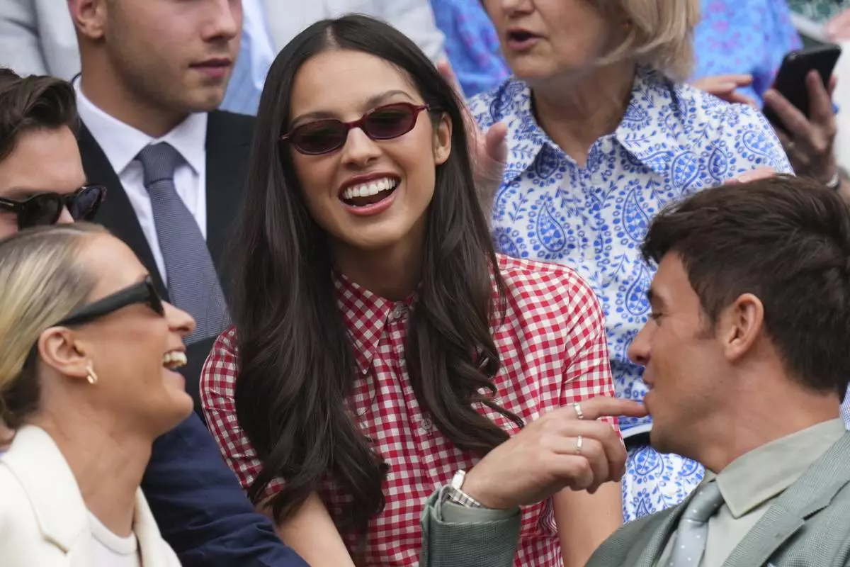 Singer Olivia Rodrigo smiles as she sits in the Royal Box at Centre Court during the Wimbledon Tennis Championships in London, Wednesday, July 2, 2025.(AP Photo/Kirsty Wigglesworth)
