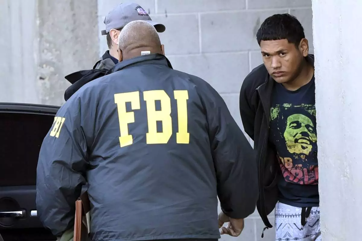 FILE - In this Thursday, March 2, 2017 photo, accused MS-13 gang member Alexi Saenz, is escorted by FBI agents in Central Islip, N.Y., after being taken into custody. (James Carbone/Newsday via AP, File)