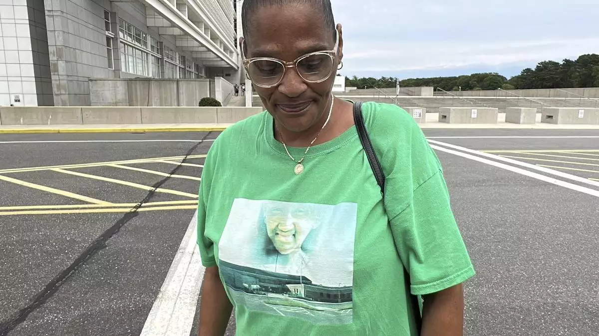 Elizabeth Alvarado stands outside federal court in Central Islip, N.Y., on Wednesday, July 2, 2025, wearing a shirt bearing an image of her daughter, Nisa Mickens, who was slain by MS-13 gang members in 2016. (AP Photo/Philip Marcelo)