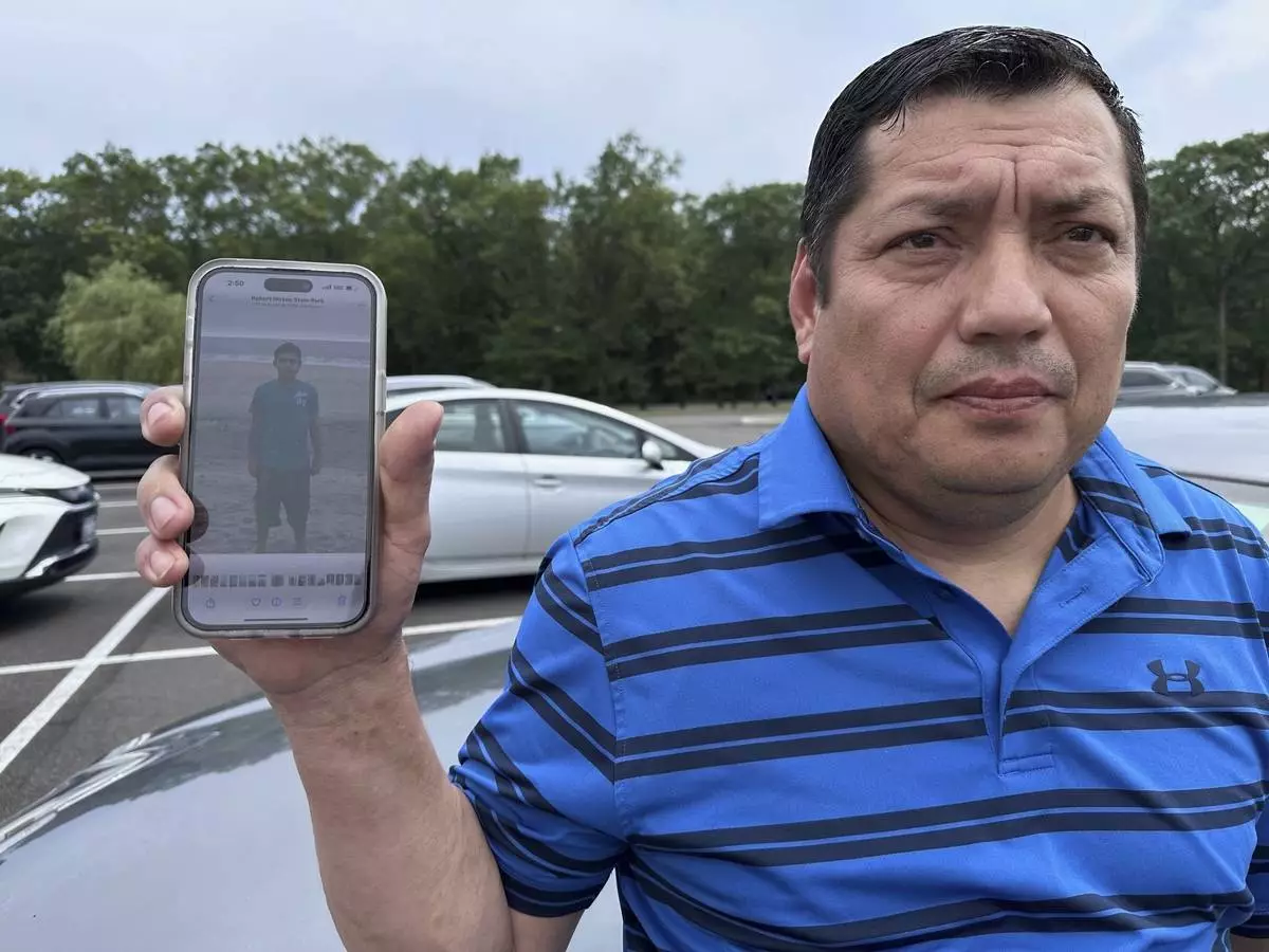 Santos Castillo stands outside federal court in Central Islip, N.Y., on Wednesday, July 2, 2025, holding up a photo on his phone of his son, Javier Castillo, who was slain by MS-13 gang members in 2016. (AP Photo/Philip Marcelo)