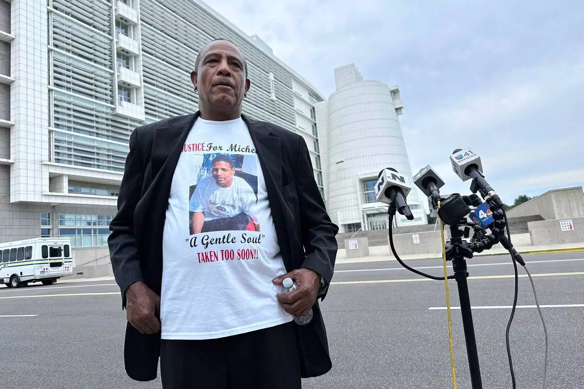 George Johnson stands outside federal court in Central Islip, N.Y. on Wednesday, July 2, 2025 wearing a shirt bearing an image of his son, Michael Johnson, who was slain by MS-13 gang members in 2016. (AP Photo/Philip Marcelo)