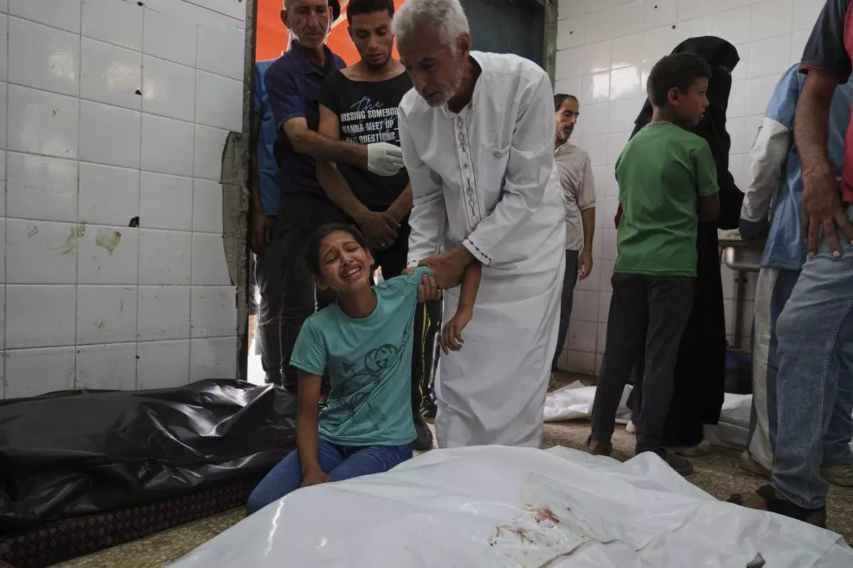 Palestinian girl Rafeef Abu Ghaly mourns the loss of her grandparents, who were killed in an Israeli airstrike on Al-Zawaideh, at Al-Aqsa Hospital morgue in Deir al-Balah, Gaza Strip, on Tuesday, July 1, 2025. (AP Photo/Abdel Kareem Hana)