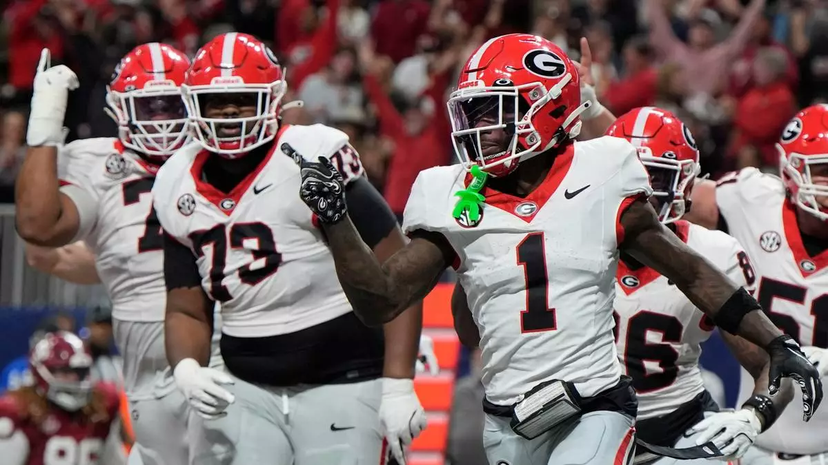 Georgia wide receiver Zachariah Branch (1) celebrates his touchdown against Alabama during the second half of a Southeastern Conference championship NCAA college football game, Saturday, Dec. 6, 2025, in Atlanta. (AP Photo/Mike Stewart)