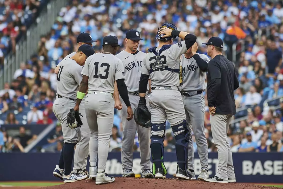 New York Yankees players talk on the mound during the first inning of a baseball game against the Toronto Blue Jays in Toronto, Wednesday, July 2, 2025. (Sammy Kogan/The Canadian Press via AP)