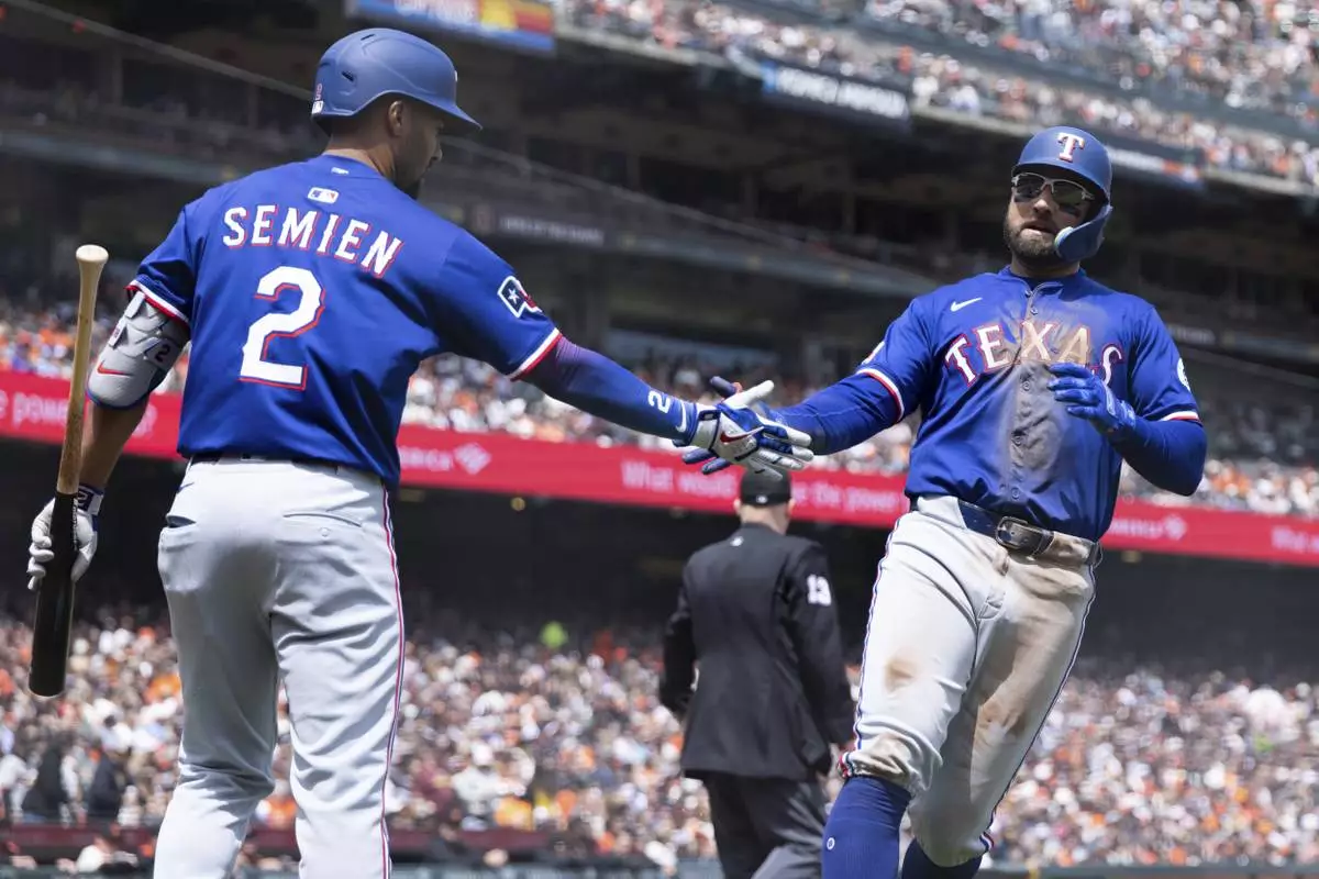 FILE - Texas Rangers' Kevin Pillar is congratulated by Marcus Semien (2) after scoring on a Jake Burger sacrifice fly during the third inning of a baseball game against the San Francisco Giants, April 26, 2025, in San Francisco. (AP Photo/Benjamin Fanjoy, File)