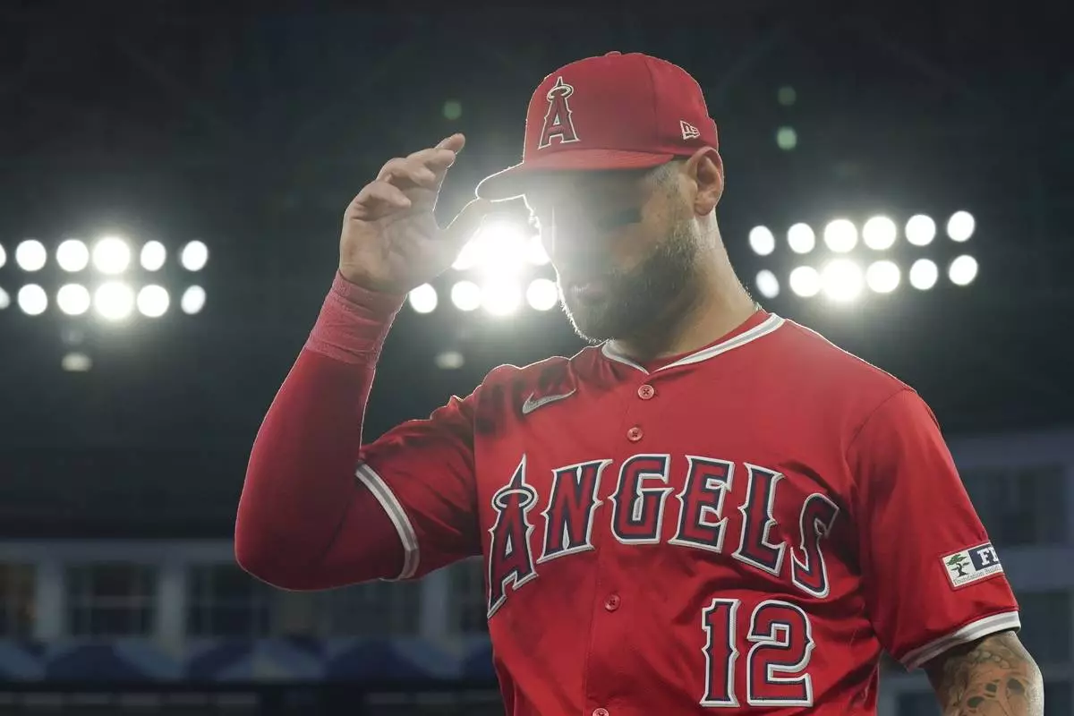 FILE - Los Angeles Angels outfielder Kevin Pillar walks back to the dugout at the end of fourth inning during a baseball game against the Toronto Blue Jays in Toronto, Aug. 23, 2024. (Chris Young/The Canadian Press via AP, File)
