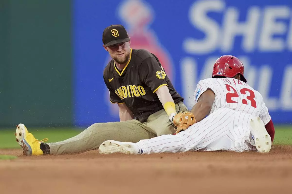 Philadelphia Phillies' Johan Rojas, right, steals second past San Diego Padres second baseman Jake Cronenworth during the seventh inning in the second baseball game of a doubleheader Wednesday, July 2, 2025, in Philadelphia. (AP Photo/Matt Slocum)