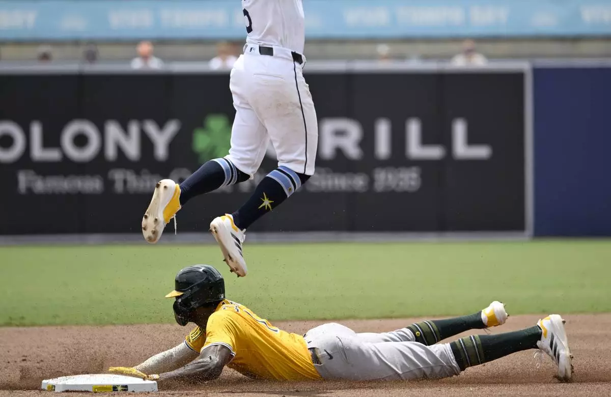 Athletics' Denzel Clarke steals second base as the throw is too high for Tampa Bay Rays shortstop Taylor Walls during the second inning of a baseball game Wednesday, July 2, 2025, in Tampa, Fla. (AP Photo/Jason Behnken)