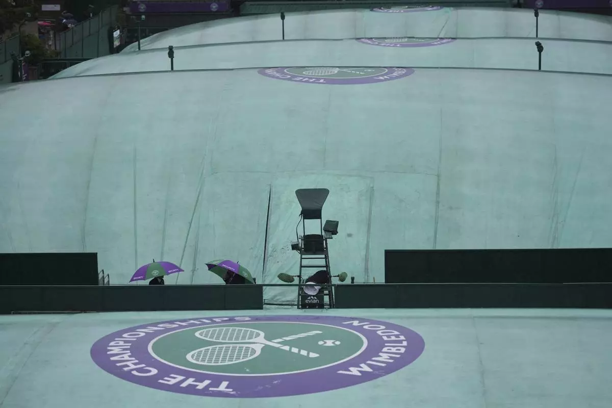 The courts remain covered as rain falls on day three at the Wimbledon Tennis Championships in London, Wednesday, July 2, 2025. (AP Photo/Alastair Grant)