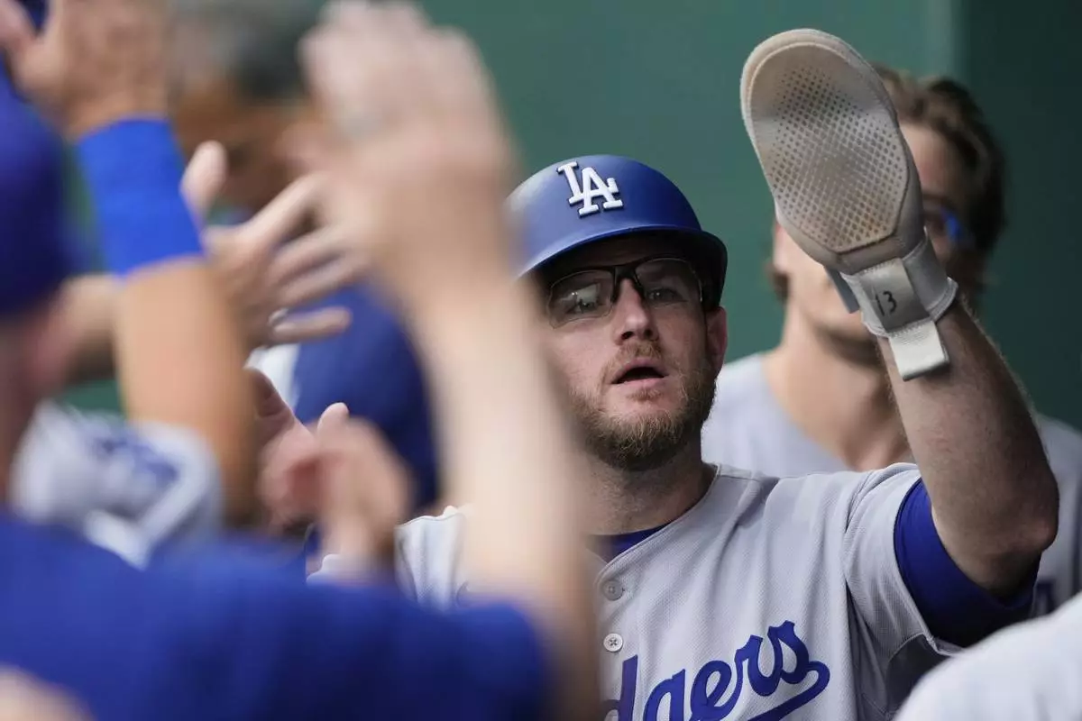 Los Angeles Dodgers' Max Muncy celebrates in the dugout after scoring on a single by Miguel Rojas during the seventh inning of a baseball game against the Kansas City Royals, Sunday, June 29, 2025, in Kansas City, Mo. (AP Photo/Charlie Riedel)