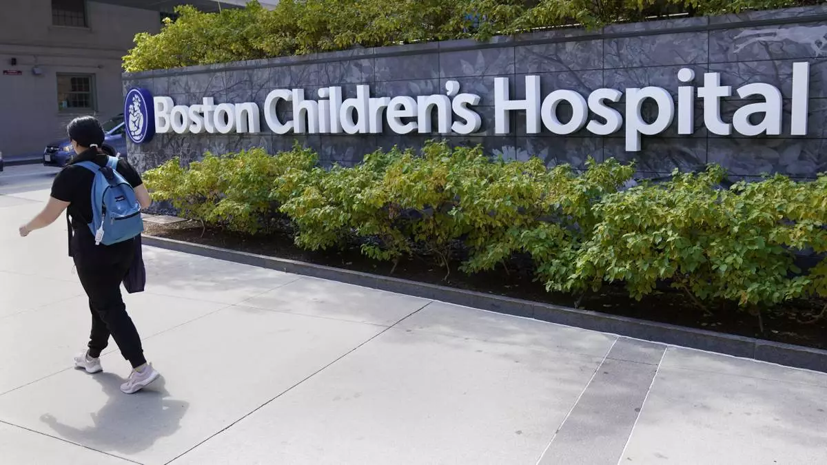 FILE — A woman walks past a sign outside the Boston Children's Hospital, Aug. 18, 2022, in Boston. (AP Photo/Charles Krupa, File)