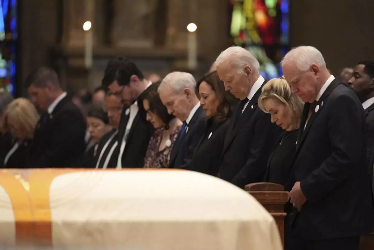 From left, Minnesota attorney general Keith Ellison, Tom Weber, Lt. Gov. Peggy Flanagan, former Minnesota Gov. Mark Dayton, former US Vice President Kamala Harris, former US President Joe Biden, Gwen Walz and Minnesota Gov. Tim Walz attend funeral services for Mark and Melissa Hortman at the Basilica of St. Mary in Minneapolis, Minn., on Saturday, June 28, 2025. (Alex Kormann/Star Tribune via AP, Pool)