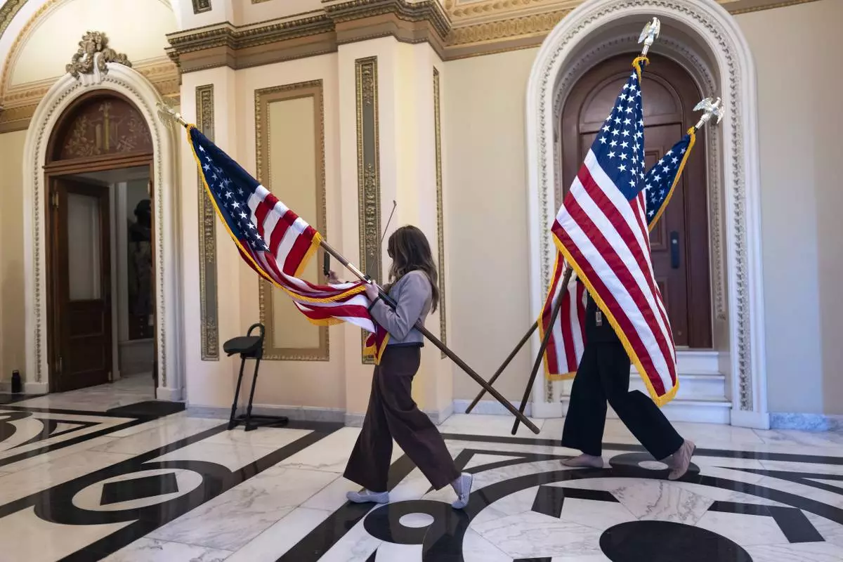 House staffers carry American flags through a corridor outside the House chamber which will be used for a ceremony with Speaker of the House Mike Johnson, R-La., after final passage of President Donald Trump's signature bill of tax breaks and spending cuts, at the Capitol in Washington, Thursday, July 3, 2025. (AP Photo/J. Scott Applewhite)