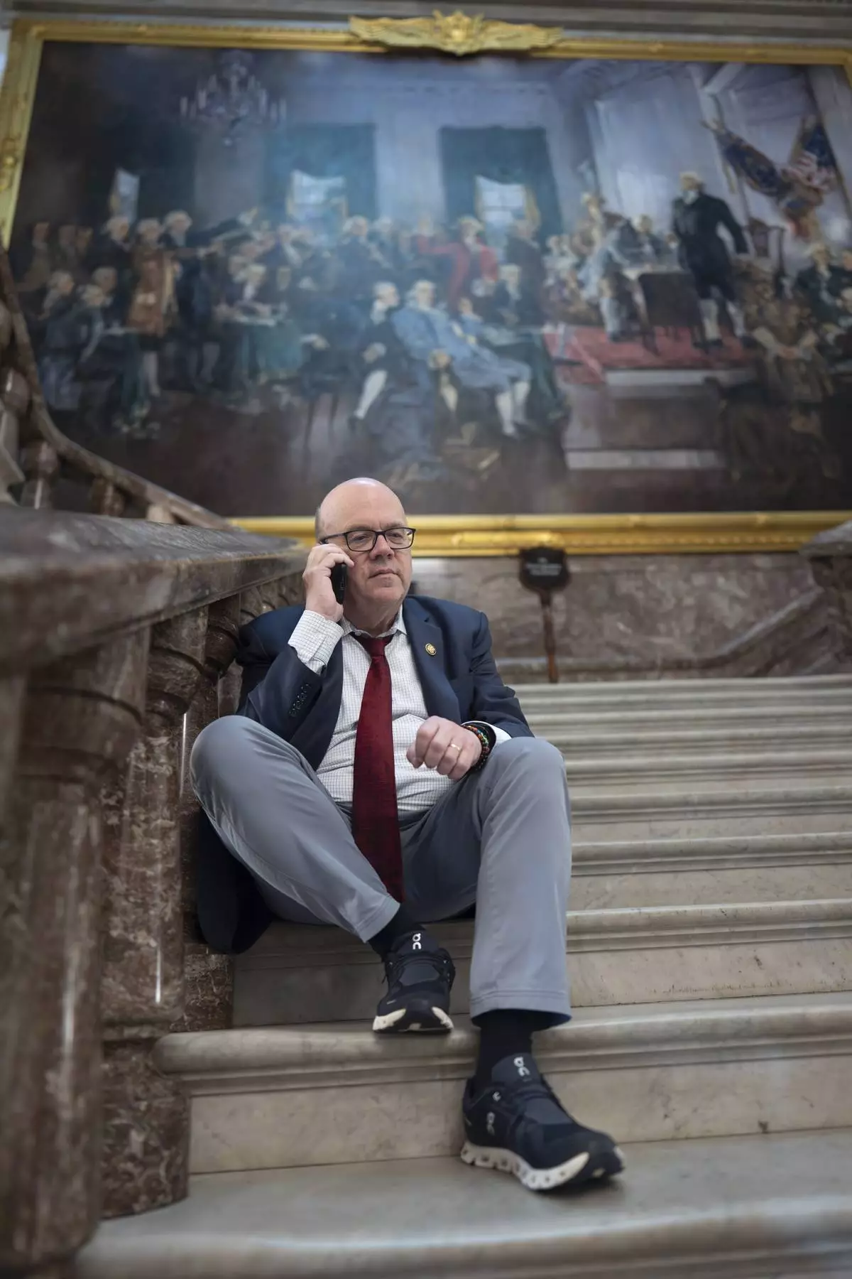 Rep. Jim McGovern, D-Mass., the top Democrat on the House Rules Committee, waits on the marble stairway outside the House chamber before the vote on President Donald Trump's signature bill of tax breaks and spending cuts, at the Capitol in Washington, Thursday, July 3, 2025. (AP Photo/J. Scott Applewhite)