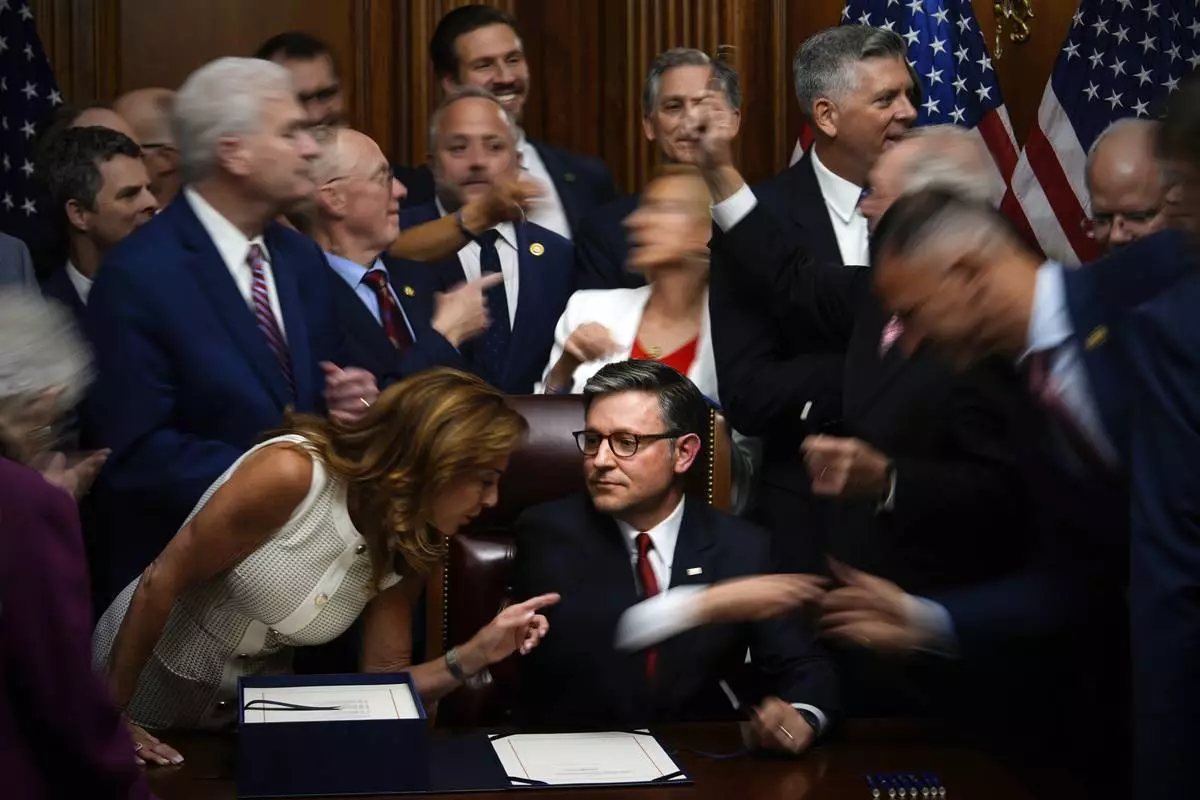 Republican members of Congress reach to shake hands with Speaker of the House Mike Johnson, R-La., center bottom, after Johnson signed President Donald Trump's signature bill of tax breaks and spending cuts, Thursday, July 3, 2025, at the Capitol in Washington. (AP Photo/Julia Demaree Nikhinson)