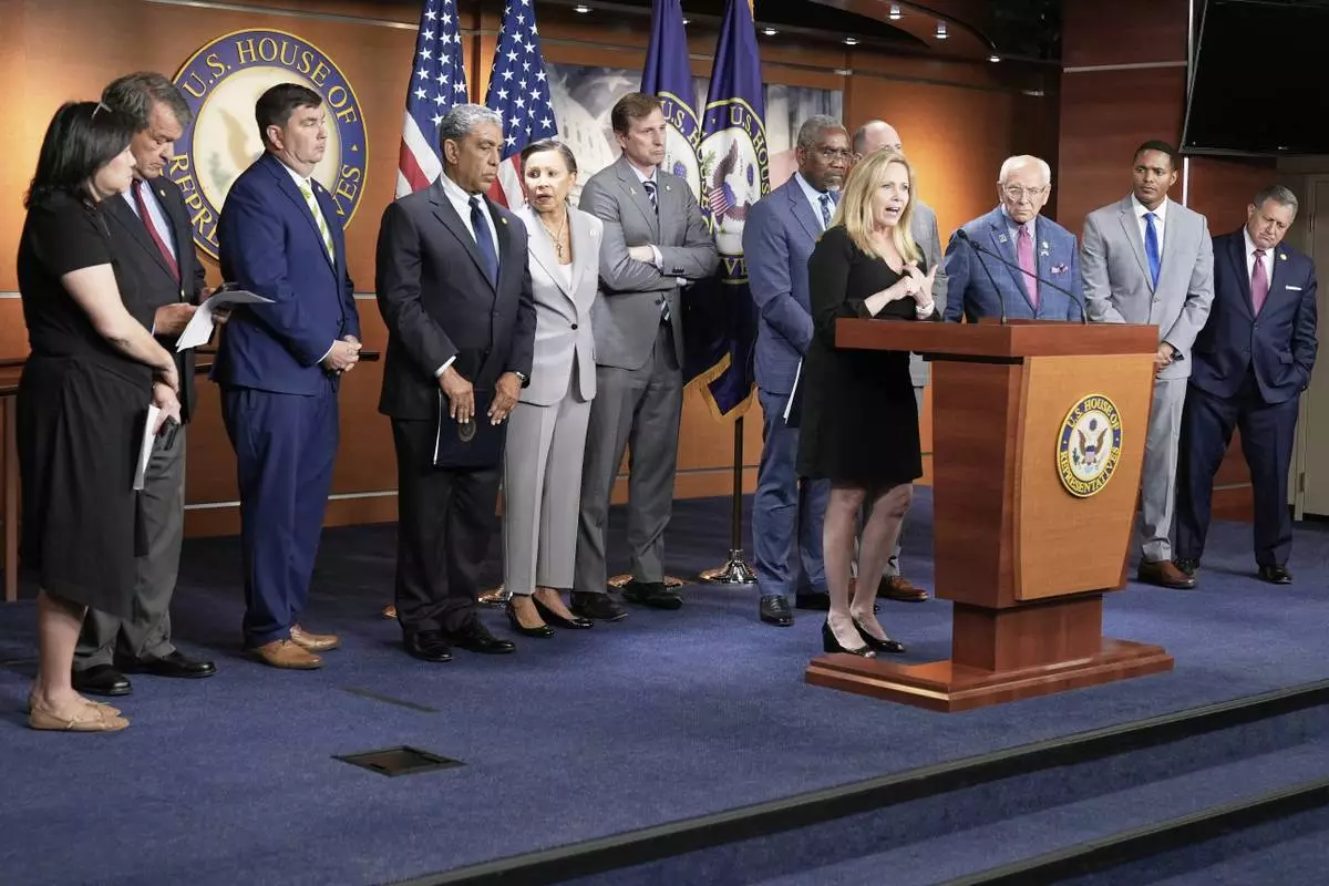 Rep. Madeleine Dean, D-Pa., center, speaks during a news conference at the U.S. Capitol, Wednesday, July 2, 2025, in Washington. (AP Photo/Mariam Zuhaib)