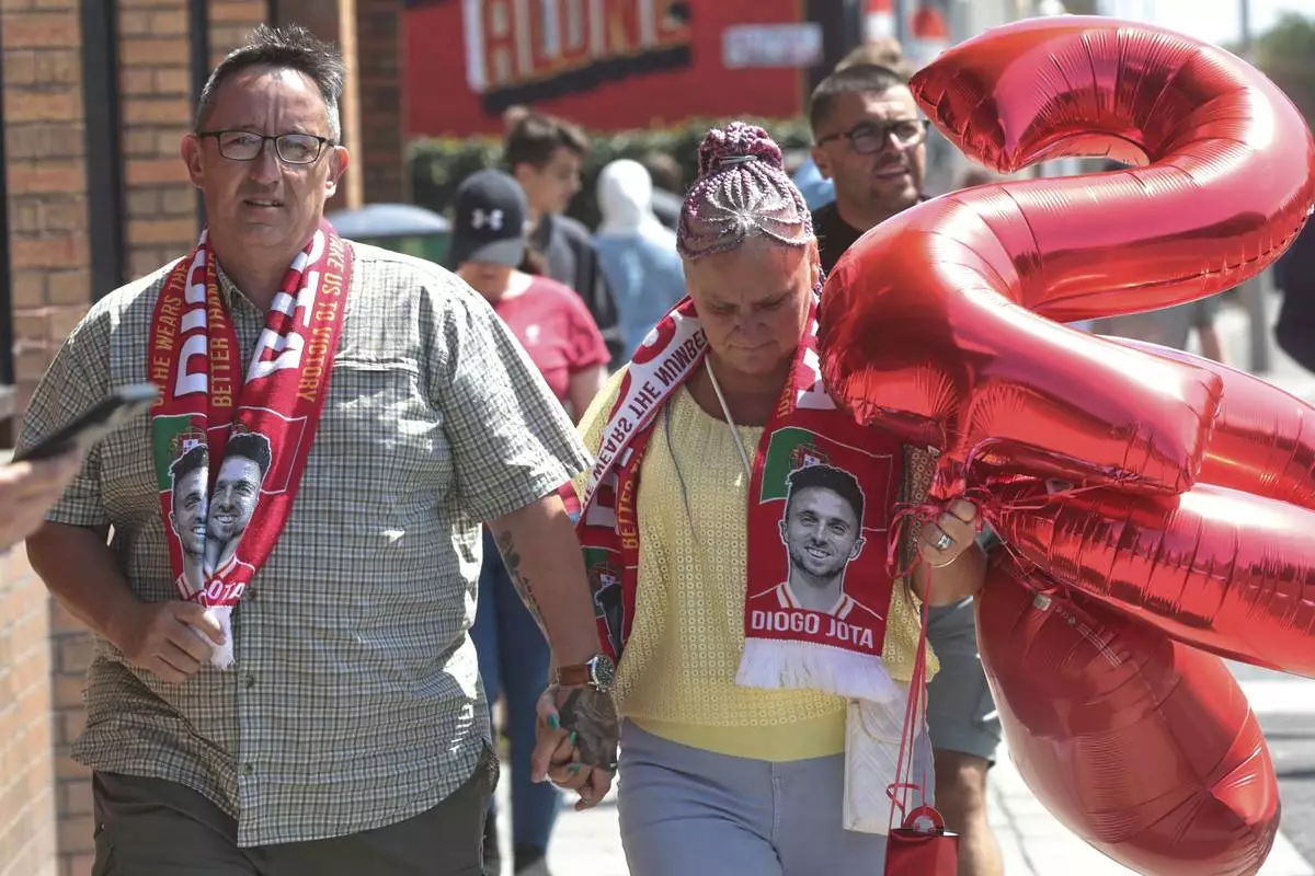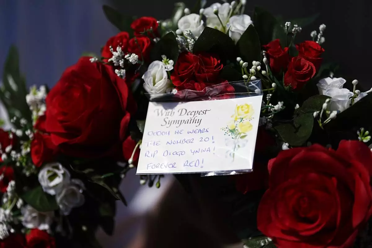 Liverpool fans placed flowers and team scarves outside Anfield stadium after news of Jota's death spread.