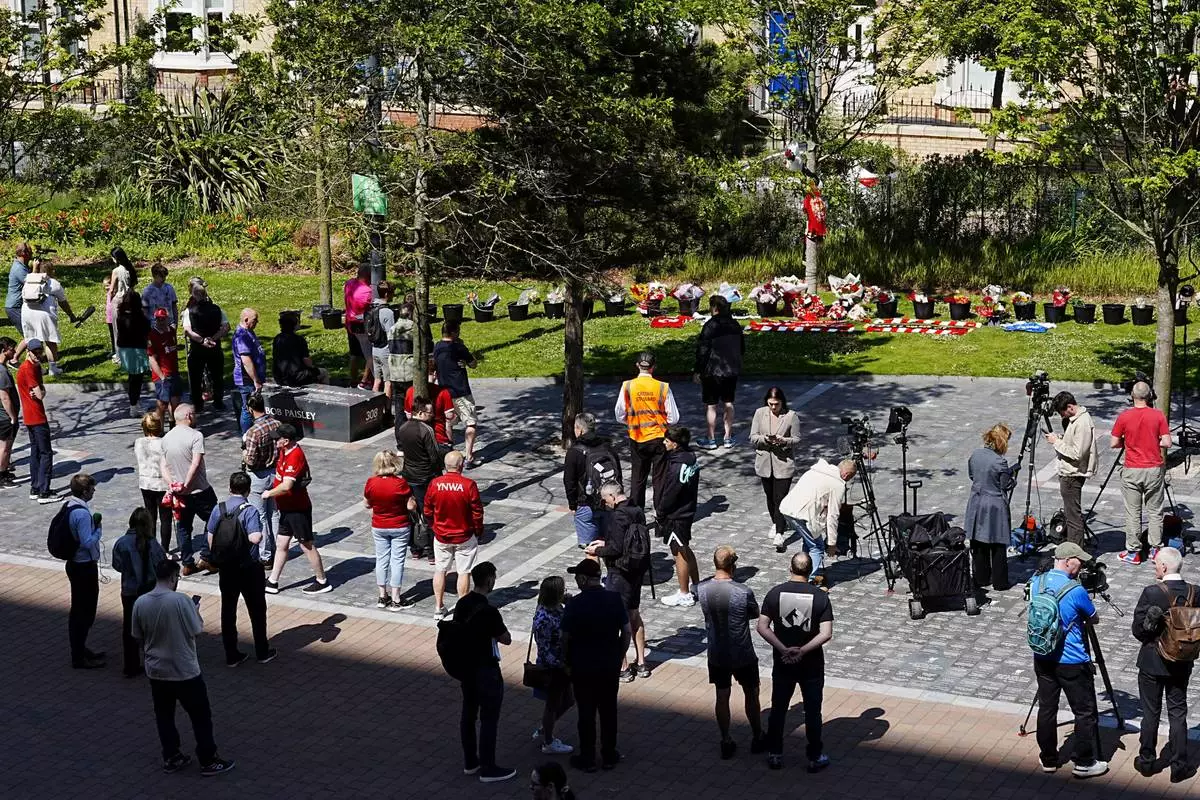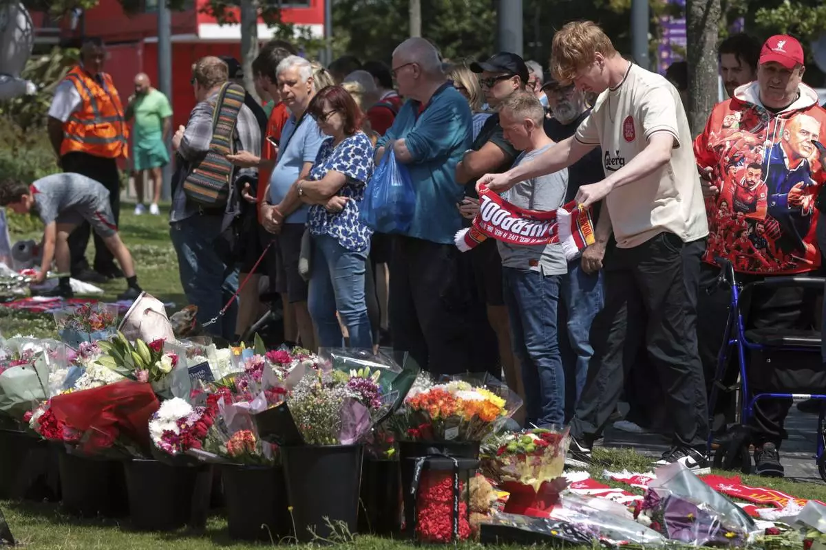 People arrive to leave tributes in memory of Liverpool player Diogo Jota at Anfield Stadium, home of FC Liverpool in Liverpool, Thursday, July 3, 2025.(AP Photo/Ian Hodgson)