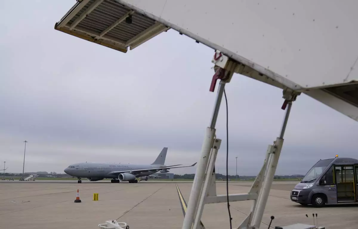 FILE - A British Royal Airforce Voyager aircraft carrying members of the British armed forces 16 Air Assault Brigade arrives at Brize Norton, England, Saturday, Aug. 28, 2021. (AP Photo/Alastair Grant, Pool, File)