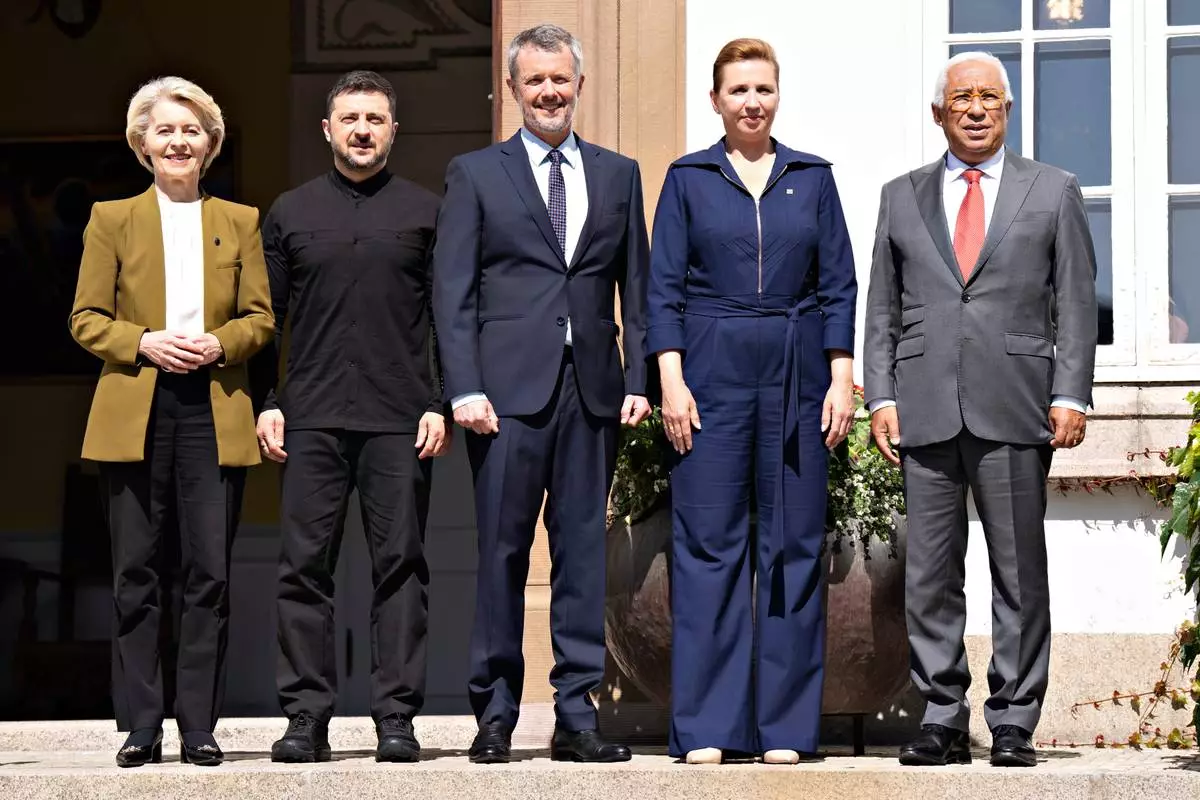 From left, President of the EU Commission Ursula von der Leyen, Ukraine's President Volodymyr Zelenskyy, Denmark's King Frederik, Denmark's Prime Minister Mette Frederiksen, and President of the European Council Antonio Costa pose as they arrive at Marselisborg Castle on the occasion of Denmark taking over the EU presidency, in Aarhus, Denmark, Thursday, July 3, 2025. (Henning Bagger/Ritzau Scanpix via AP)