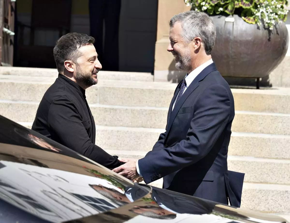 Denmark's King Frederik, right, receives Ukraine's President Volodymyr Zelenskyy as he arrives at Marselisborg Castle on the occasion of Denmark taking over the EU presidency, in Aarhus, Denmark, Thursday, July 3, 2025. (Henning Bagger/Ritzau Scanpix via AP)