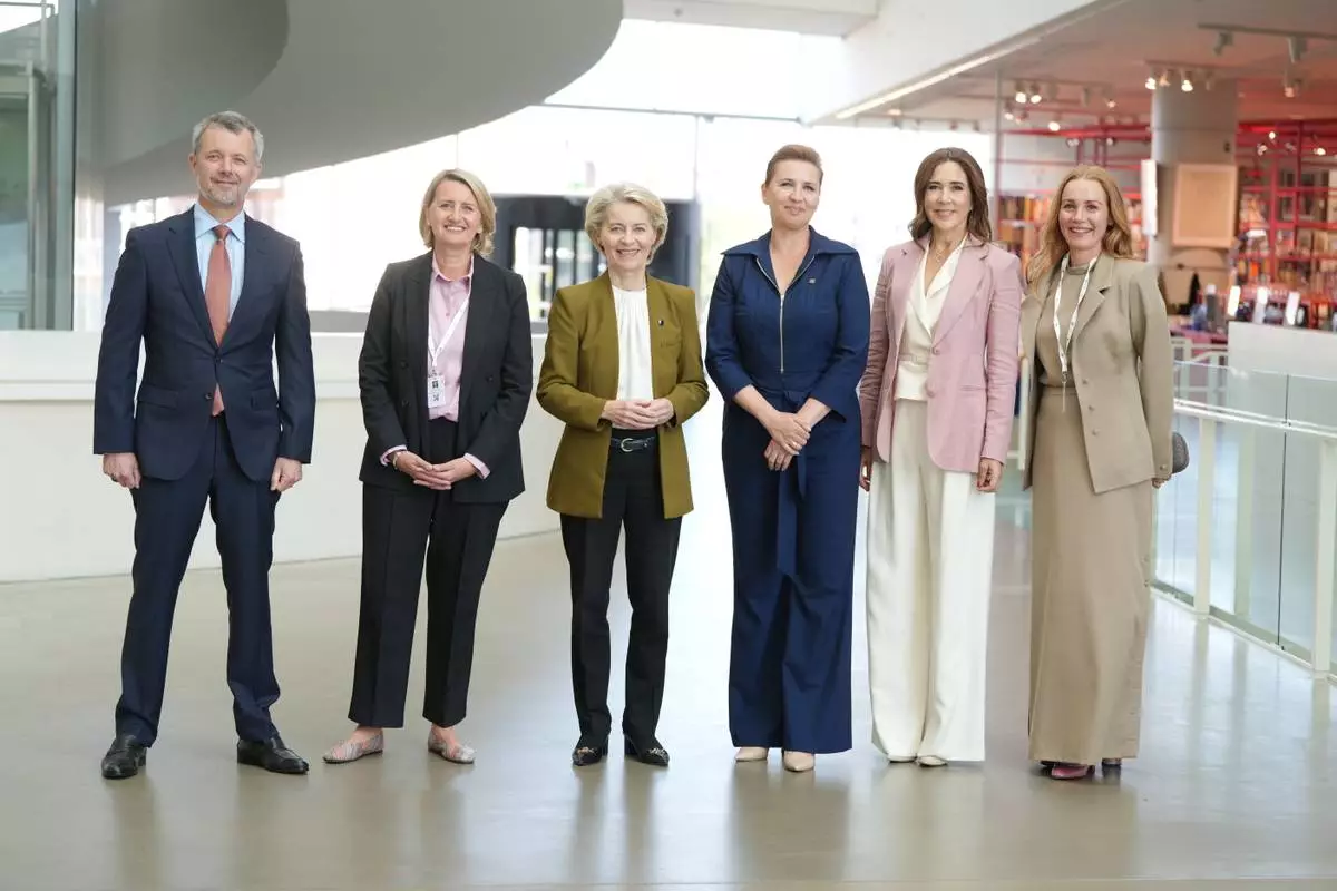 From left, Denmark's King Frederik, museum director Rebecca Matthew, European Commission President Ursula von der Leyen, Denmark's Prime Minister Mette Frederiksen and Denmark's Queen Mary pose for a phot during the official opening of Denmark's EU presidency in Aarhus, Denmark, Thursday July 3, 2025. (Liselotte Sabroe/Ritzau Scanpix via AP)
