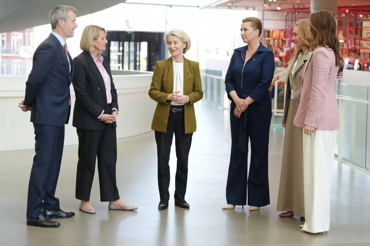 From left, Denmark's King Frederik, museum director Rebecca Matthew, European Commission President Ursula von der Leyen, Denmark's Prime Minister Mette Frederiksen and Denmark's Queen Mary speak, during the official opening of Denmark's EU presidency in Aarhus, Denmark, Thursday July 3, 2025. (Liselotte Sabroe/Ritzau Scanpix via AP)