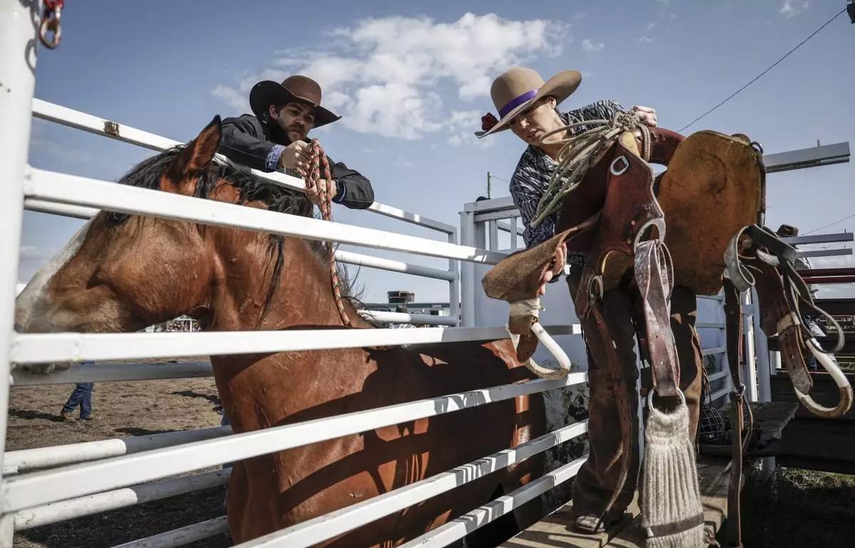 Courtney Beverly, from Winfield, Alberta, saddles her horse in the chutes before competing in women's ranch bronc during rodeo action in Crossfield, Alberta, Saturday, June 14, 2025. (Jeff McIntosh/The Canadian Press via AP)