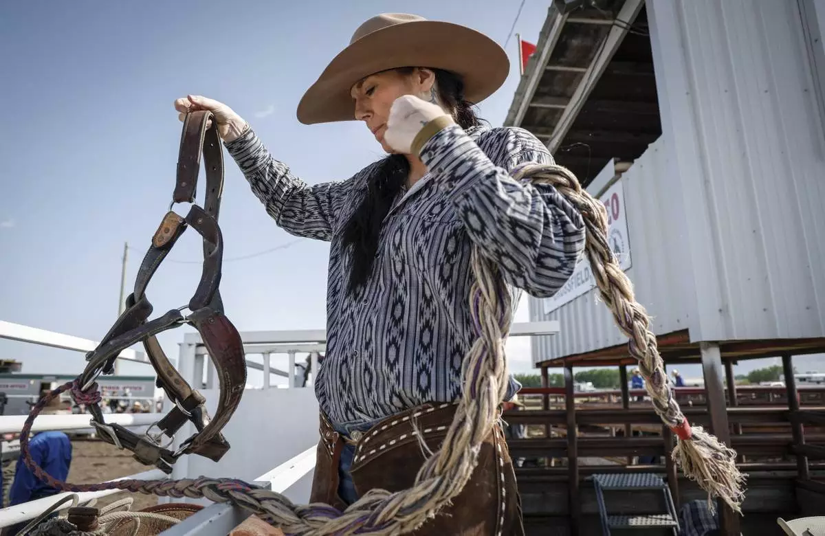 Courtney Beverly, from Winfield, Alberta, prepares to bridle her horse in the chutes before competing in women's ranch bronc during rodeo action in Crossfield, Alberta, Saturday, June 14, 2025. (Jeff McIntosh/The Canadian Press via AP)